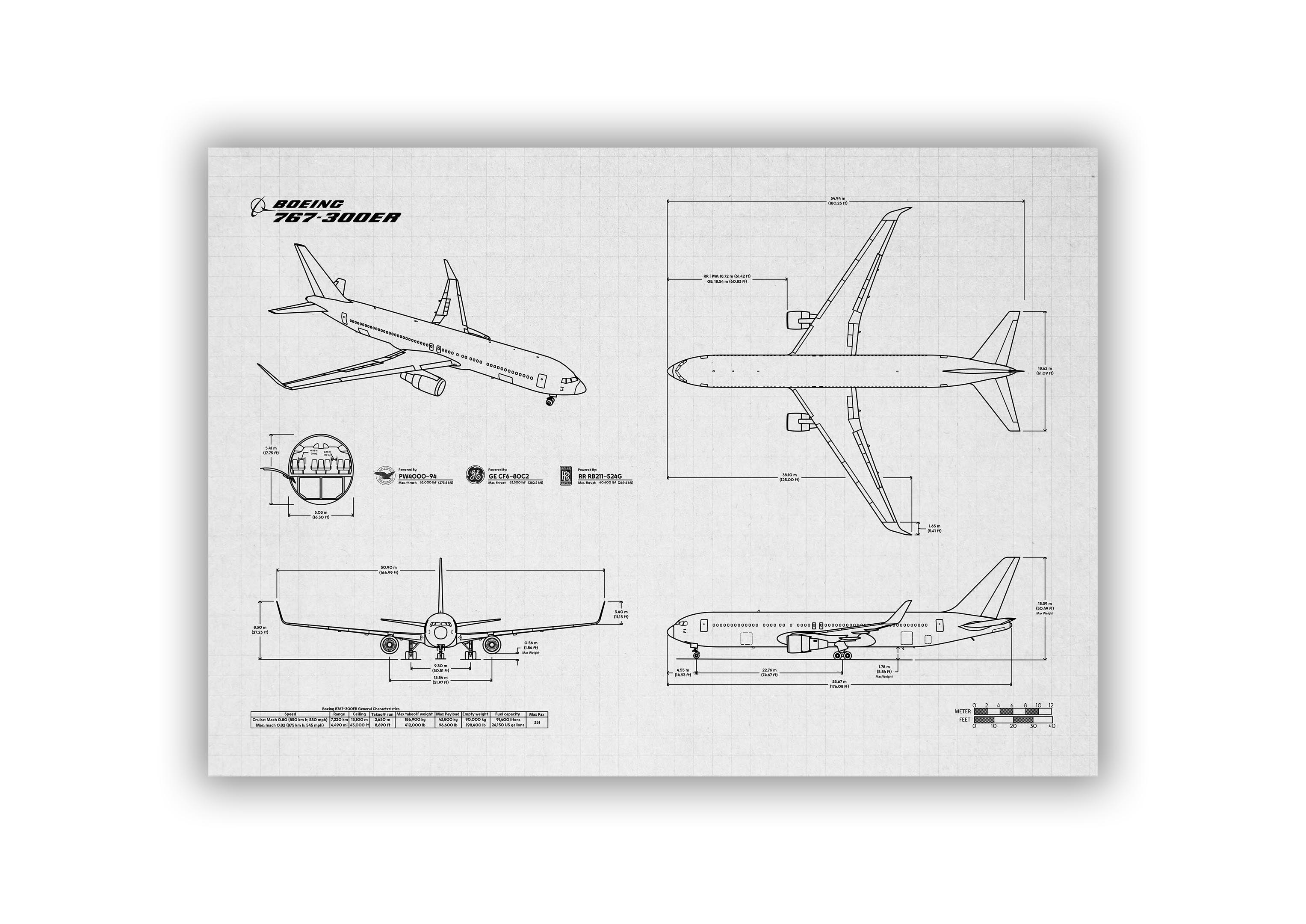 Boeing B767-300 Landscape Blueprint Poster