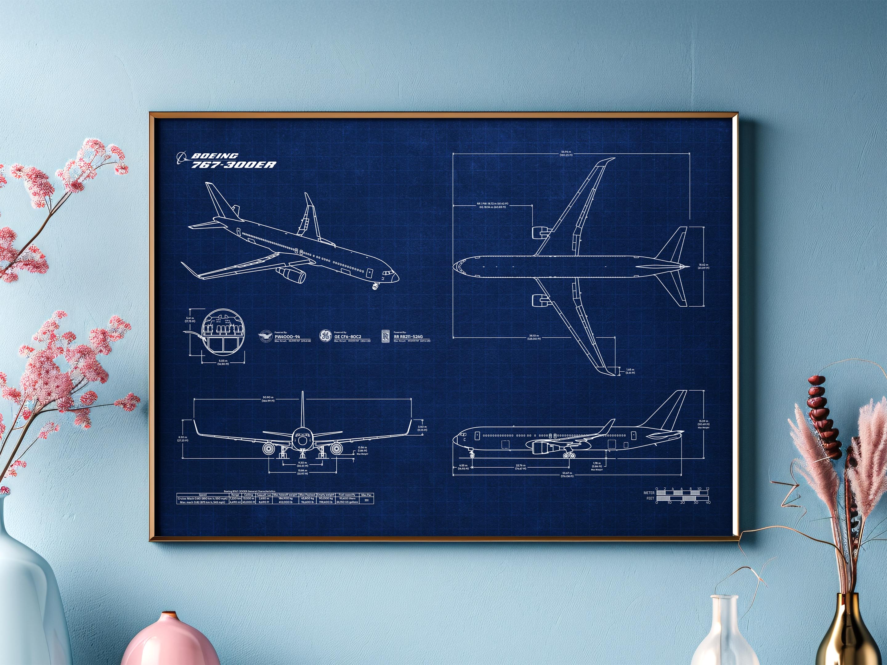 🎁 Perfect for collectors and aviation lovers This artwork honours the Boeing B767-300 Landscape Blueprint Poster as the heart of the 767 family. It suits homes, aviation offices, and collector walls.