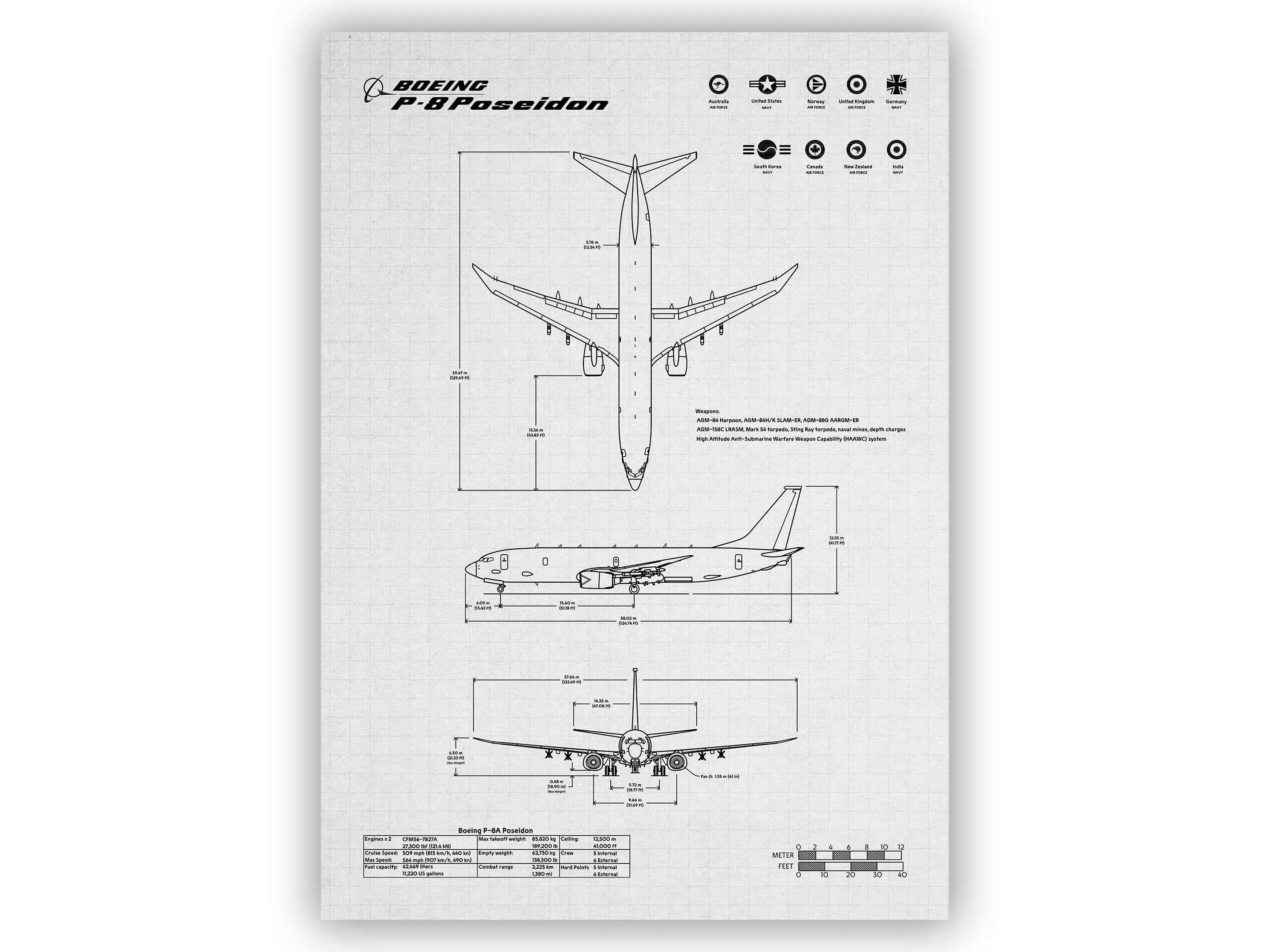 The Boeing P-8 Poseidon Portrait Blueprint Poster combines endurance with cutting-edge sensors.