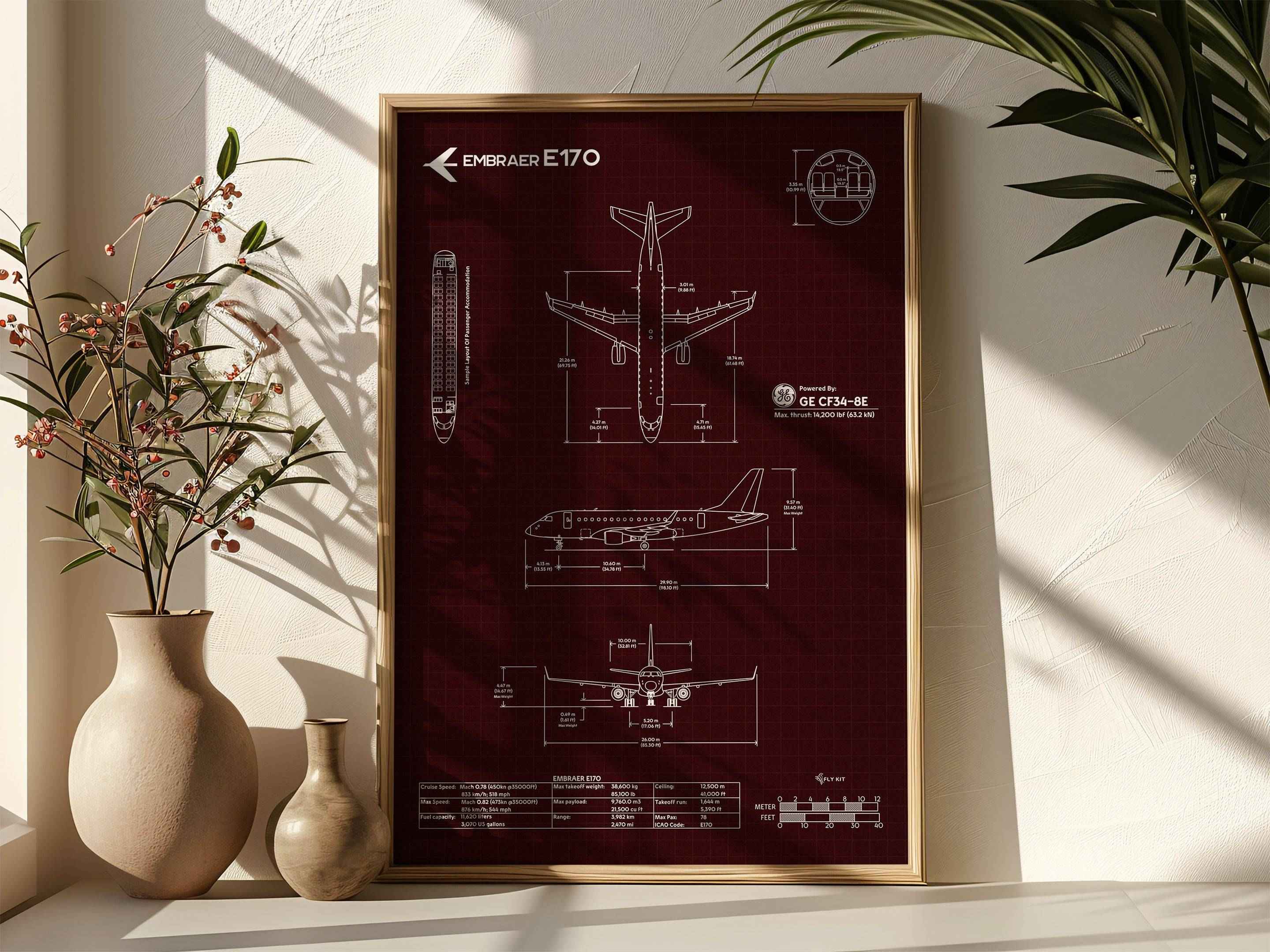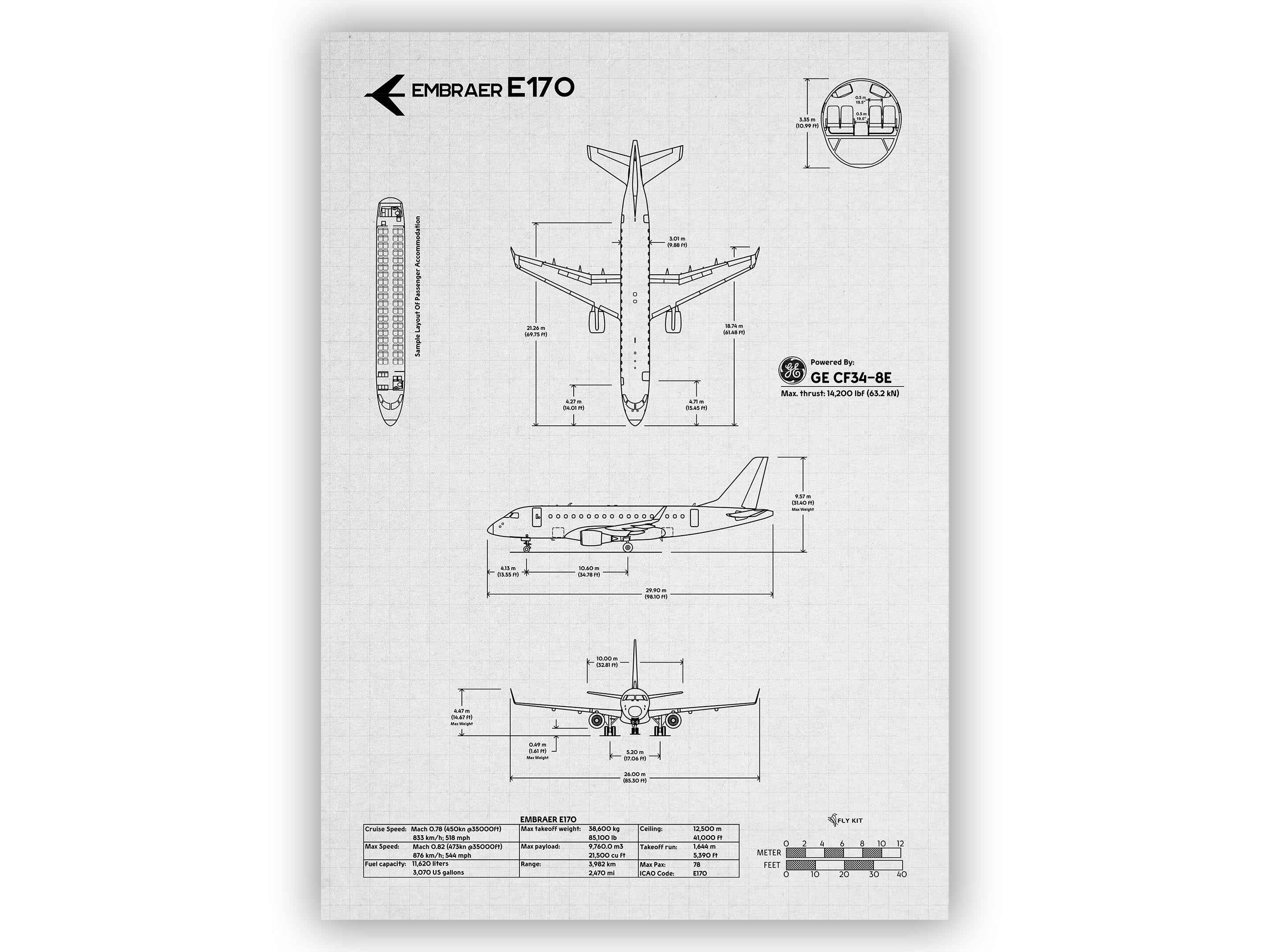 🎁 Perfect for collectors and aviation lovers This print celebrates the Embraer E170 Portrait Blueprint Poster as the first of the E-Jet family. It is perfect for aviation homes, professional spaces, and collector walls.