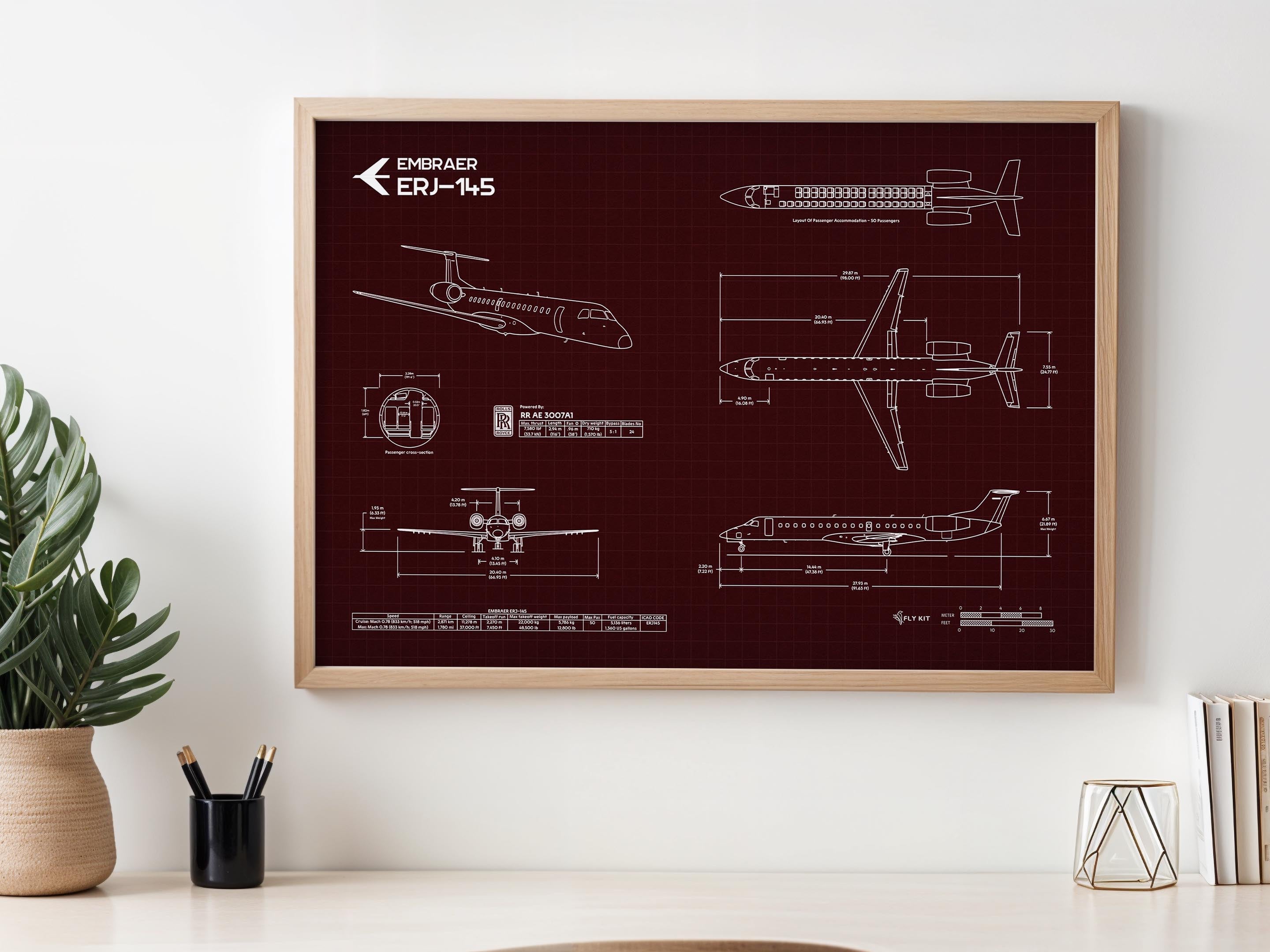 ✨ Embraer ERJ-145 Landscape Blueprint Poster celebrates the largest aircraft of the original ERJ family.